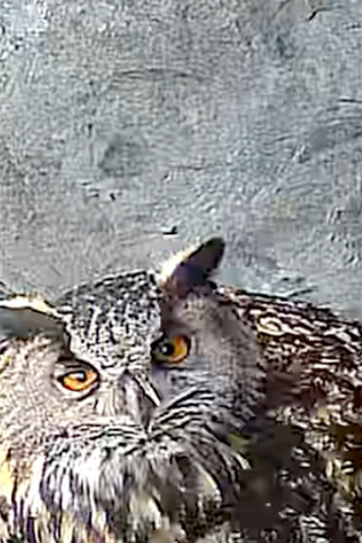 Am Brutplatz vor Cam 1 und unterhalb von Cam 2 bahnt sich ebenfalls Nachwuchs an. Zumindest meinten wir am 14.4. bereits Piepsen aus den Eiern gehört zu haben. Waschbären in unmittelbarer Nestnähe haben wir nun schon seit einigen Tagen nicht mehr beobachtet. Haben die „Erziehungsversuche“ des Uhumännchens vielleicht die erwünschte Wirkung erzielt?