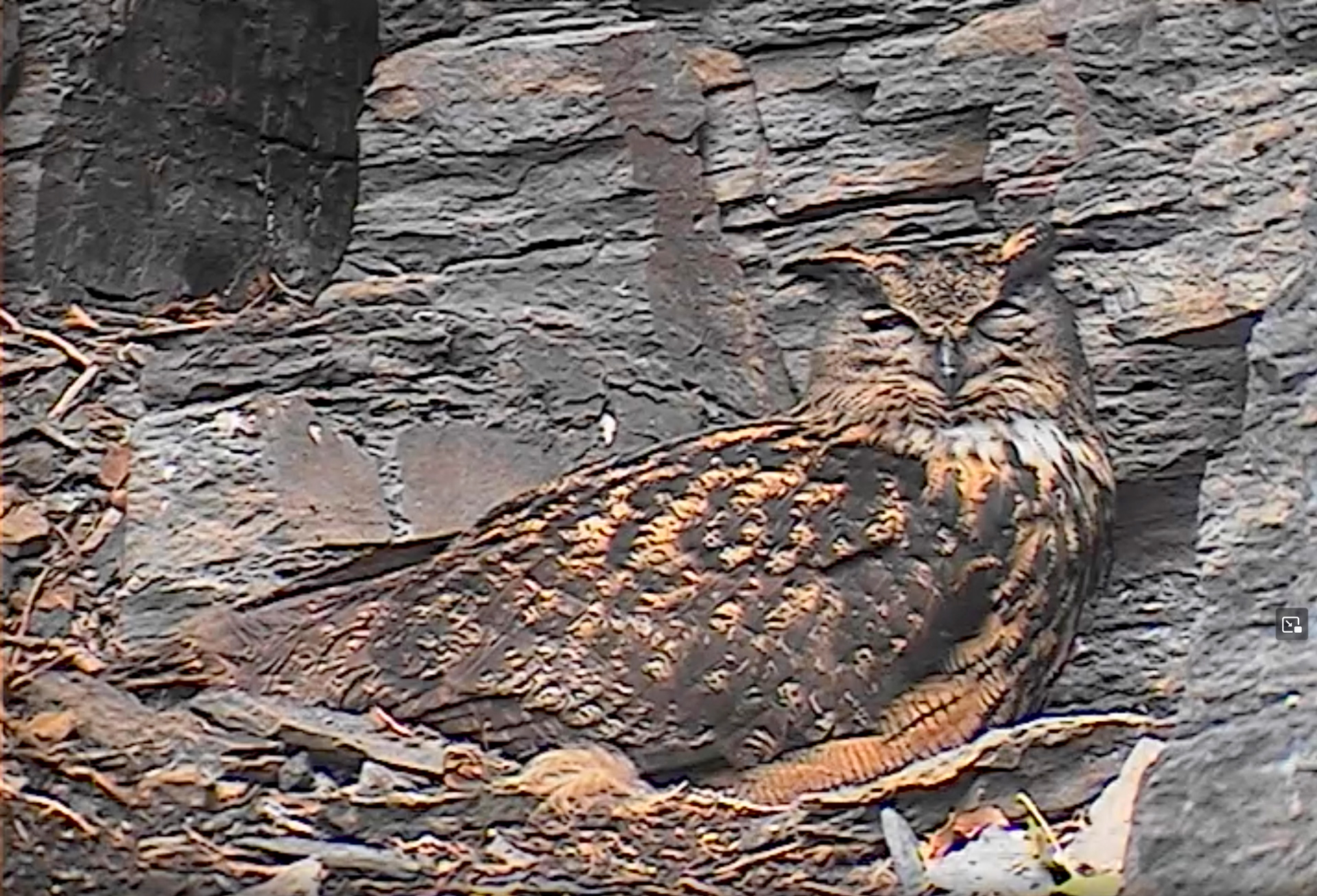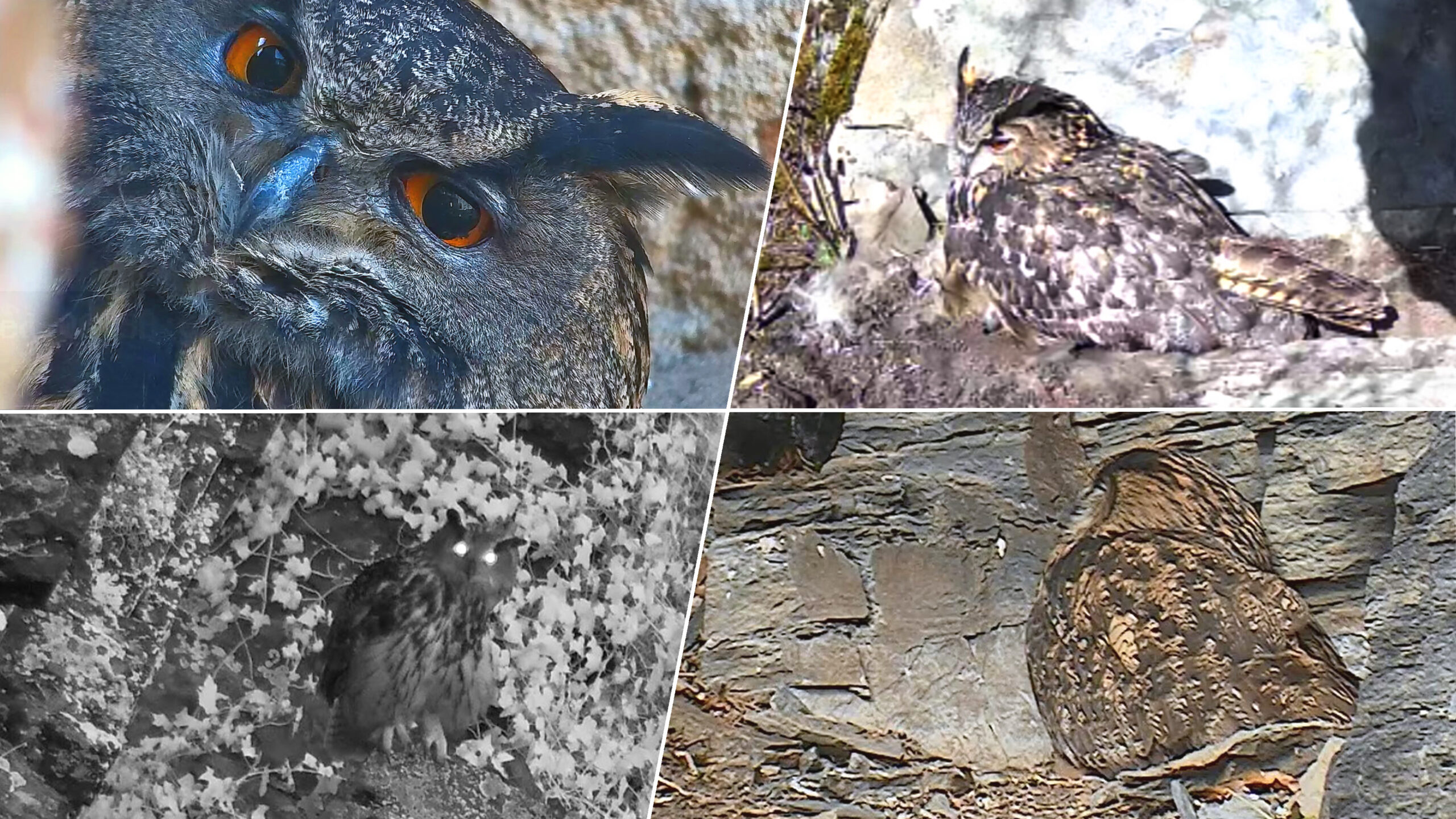 Auch an den anderen Nistplätzen im Ahrtal bahnt sich eine Veränderung an: In der traditionellen Brutnische vor Cam 1, dort, wo diverse Waschbärattacken stattfanden, sitzt öfter ein vermutlich weiblicher Uhu. Am heutigen Samstag, den 14.03., liegen dort zu seinen Füßen sogar Flaumfedern – ganz so, als hätte die große Eule Brutabsichten. Am Nachmittag liegt sie (?) sogar, fast so, als würde bald das erste Ei gelegt.